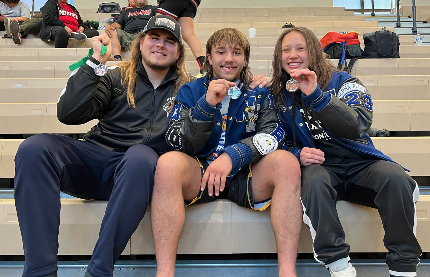 From left, West Hills High School state meet qualifiers Lance Briseno (third place, 287 pounds), Ryder Dearborn (second place, 184 pounds) and Kayla Lim (third place, 128 pounds) display their medals following the awards ceremony at last weekend’s San Diego Section Masters tournament at Mission Hills High School. They are part of 21 East County state meet qualifiers overall. Courtesy photo