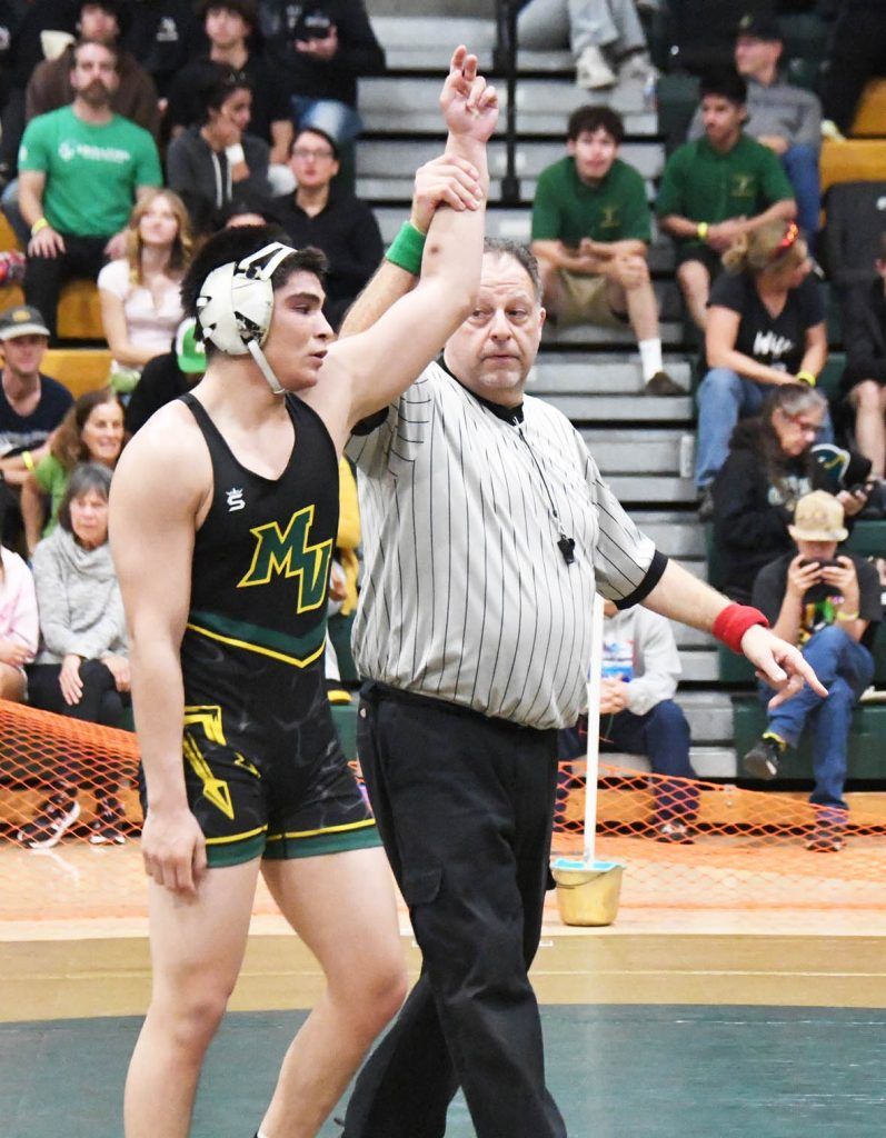 Mater Dei Catholic’s Ron Pizarro, another defending Metro champion, gained some well-deserved notoriety at 157 pounds by defeating top-seeded Noah Wisniew of Mountain Empire by an 8-5 decision to raise his season record to 29-7.