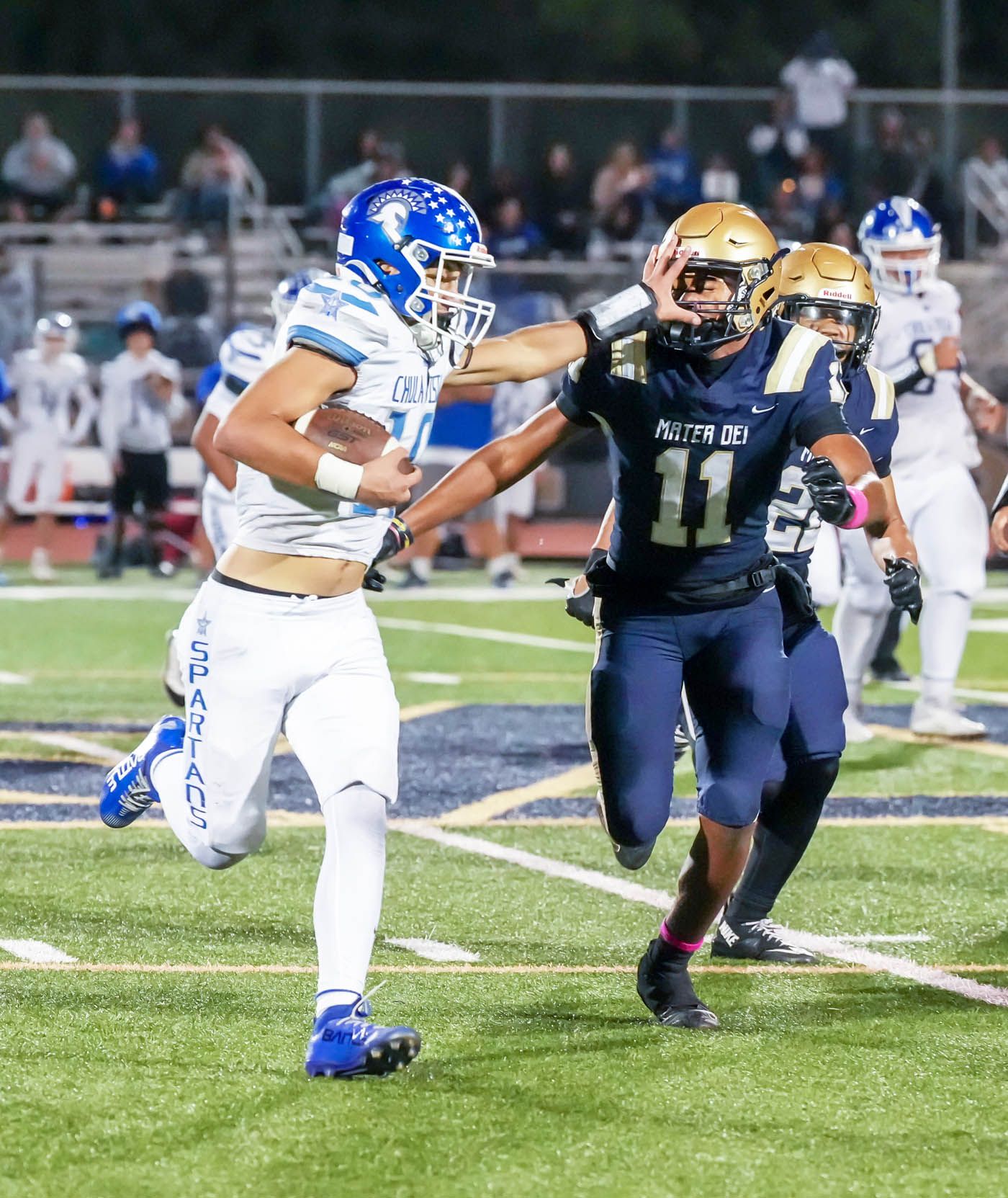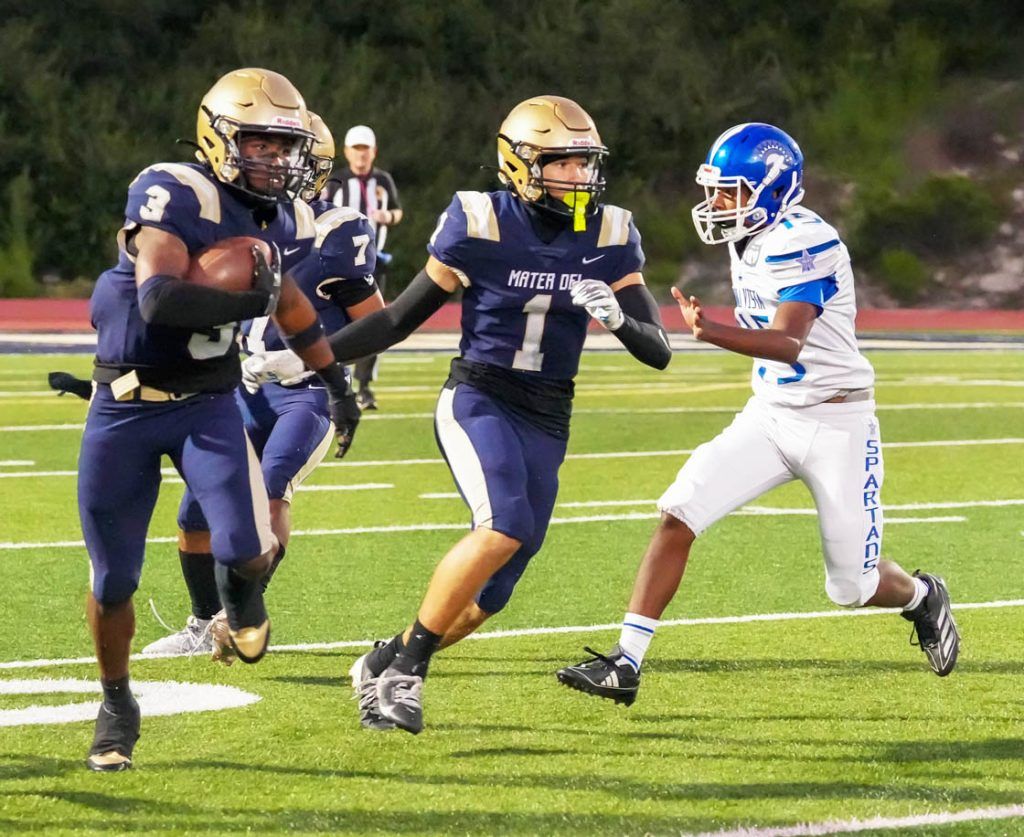 Mater Dei Catholic, the defending league champion, pulled away in their homecoming match against the visiting Chula Vista Spartans to win 27-0, while the Mustangs avoided a 0-1 start in league play with a dramatic 19-16 come-from-behind victory at Sweetwater High School.