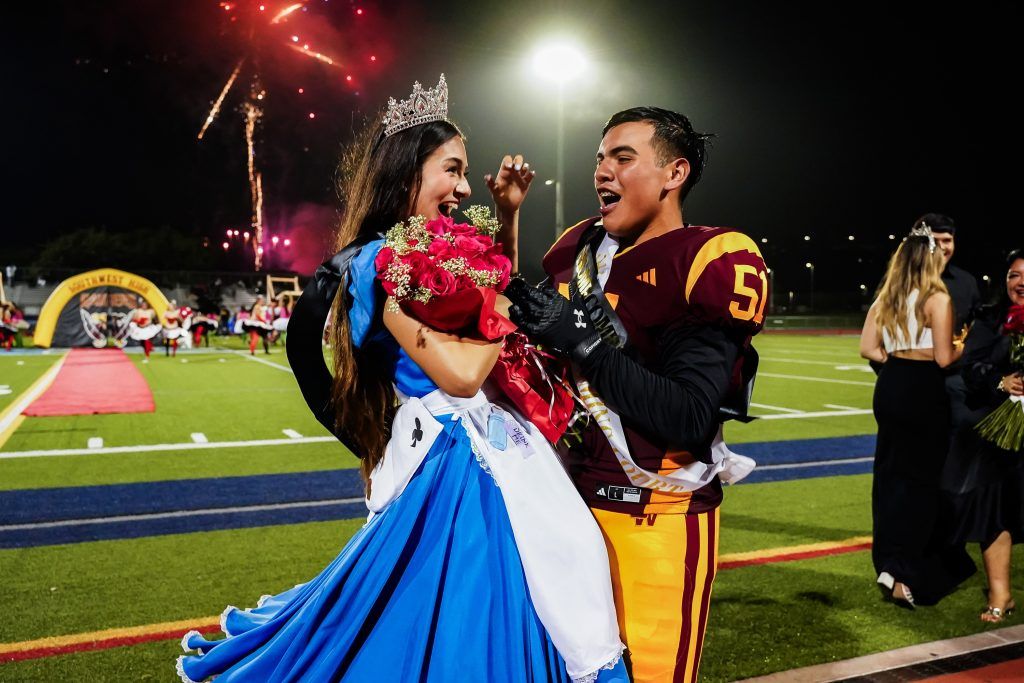 Homecoming queen Diane Sandoval (dancer in halftime show) and Homecoming king Dylan Zarsosa (center on the football team) enjoy the fireworks show.