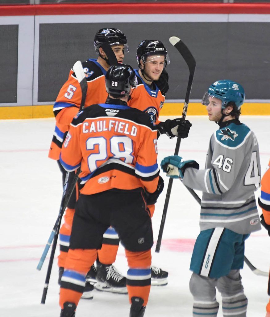 “There was a lot of good in the first bit,” San Diego head coach Matt McIlvane said. “We also gave up two breakaways in the first period, which isn’t something we’re looking to do, but the majority of the game we’re playing the way that we want to play. Then into the third period, had a neutral zone turnover that ended up in a penalty, and then they strike off their power play. It doesn’t take very long. It gets a bounce and I think it’s the very next shift, or soon after we’re giving up a rush and they put another one in. Good on us for battling back and evening the score but then unfortunately, we had a defenseman alone at the net front without a stick. It’s just kind of that kind of game. First goal goes in off of a skate, and then the next one goes in off a stick, and now we have a defenseman alone the net front. I think there’s a lot of good in this game, certainly a lot closer to the way we want to play than the Colorado game (6-0 loss on Saturday). But in the end, we’re empty handed.