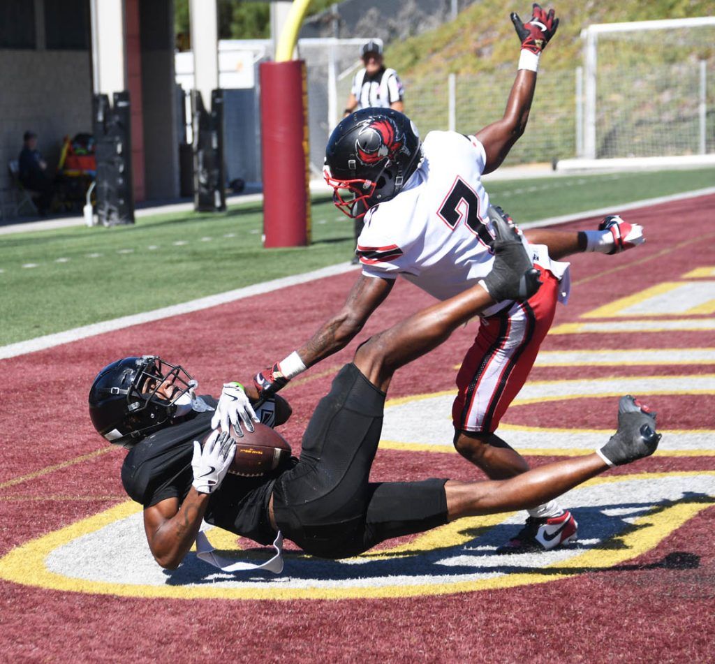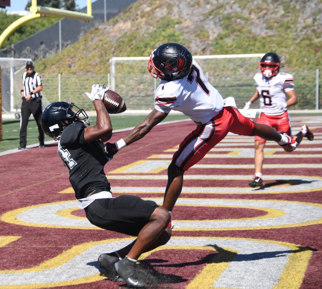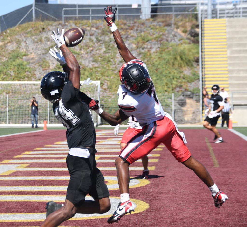 Southwestern College receiver Clint Thomas Jr. goes up against a Mt. San Jacinto College defender to come down with the football to give the host Jaguars a 21-3 halftime lead.