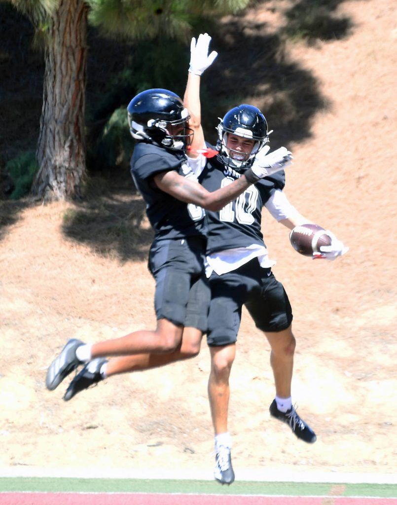 Southwestern College receiver Nic Cline celebrates his first quarter touchdown with a Jaguars teammate during last Saturday’s home game.