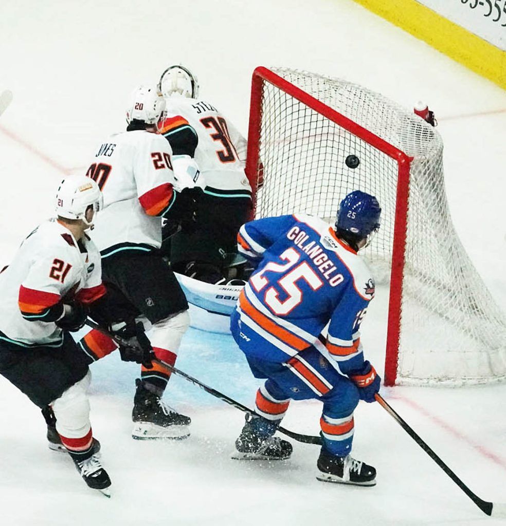 Anders Dreyer bagged two goals to increase his season numbers to 17 goals and 18 assists.
