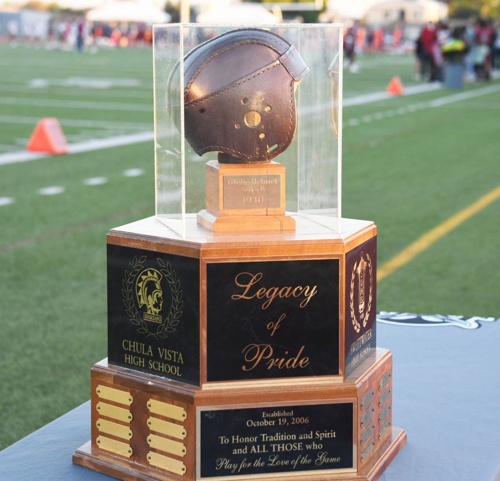 Last Friday’s game was the 79th meeting between the teams to signify the longest continuing rivalry in the San Diego Section. Since 2006 the teams have played for the rather massive Legacy of Pride trophy. Panels on the side denote Sweetwater wins and Chula Vista wins dating back to the start of the series.
