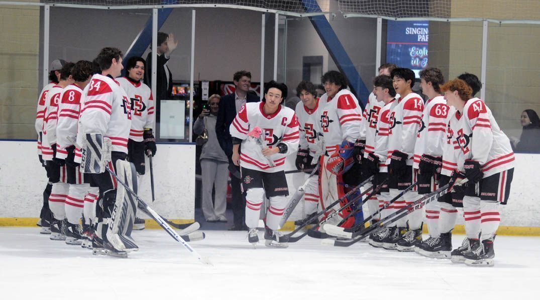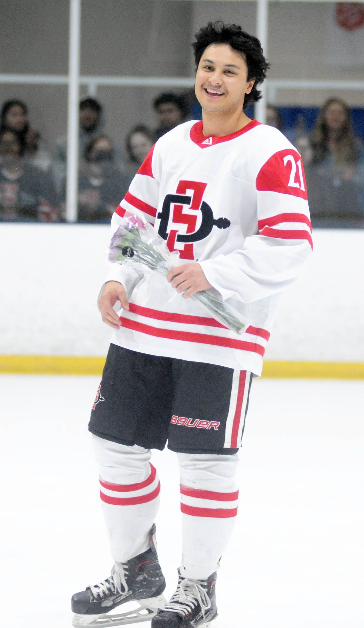 Prior to the Feb. 22 season finale, the Aztecs honored their six seniors in a pre-game ceremony: forwards Marcus Kim, Luke Desmarais, Toby Petrus, Sean Devaney and Gavin O’Bryan and forward/defenseman Lucas Bellig.