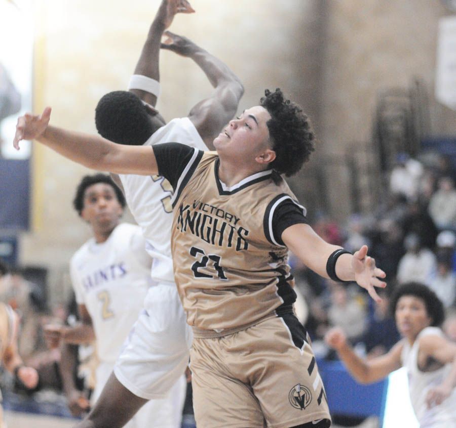 The Knights held an early modest lead before the Saints began employing a smothering defense under the basket, forcing lower-percentage perimeter shots and turnovers. St. Augustine began building a growing lead — 27-16 — before Victory Christian was able to contend with the situation and reduce the deficit to 29-22 at halftime.